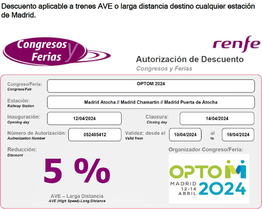 Recibirás la autorización de descuento junto con tu confirmación de inscripción al congreso. Este descuento es personal e intransferible para inscritos al congreso y deberá acompañar a los billetes en los controles de acceso al tren.